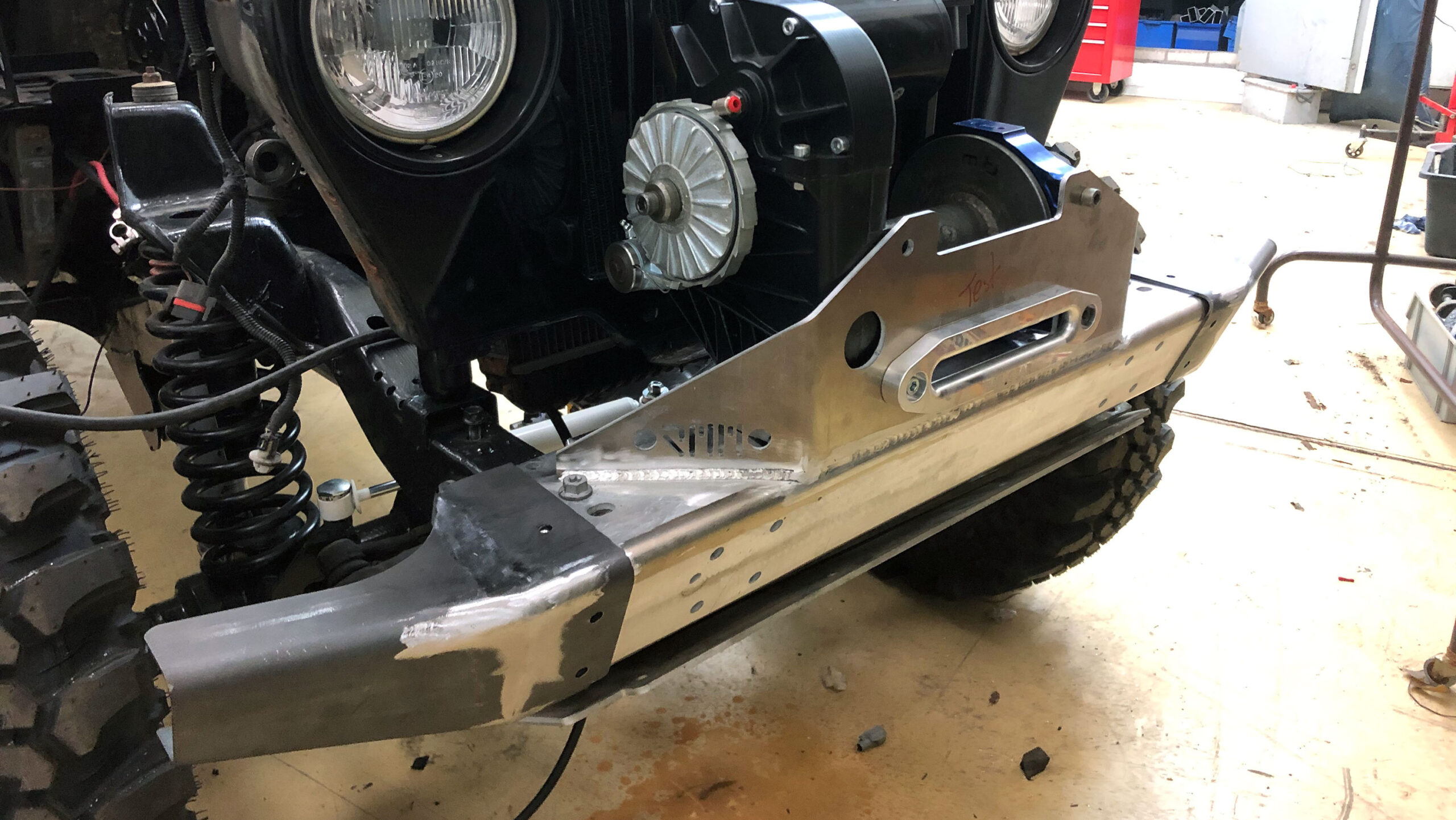 If you want, we can also build the custom winch mount onto the Bumper for you. We did various types now for Red winches, Warn and Gigglepin setups. We recommend the welded shield on the Aluminium bumper only if the winch is mounted to the base of the winch and also to the shield. On 8274 winch shields we found out that it’s possible to build it strong enough for a 1 motor setup, but since these winches are only mounted to the shield, a dual motor setup is not recommended.