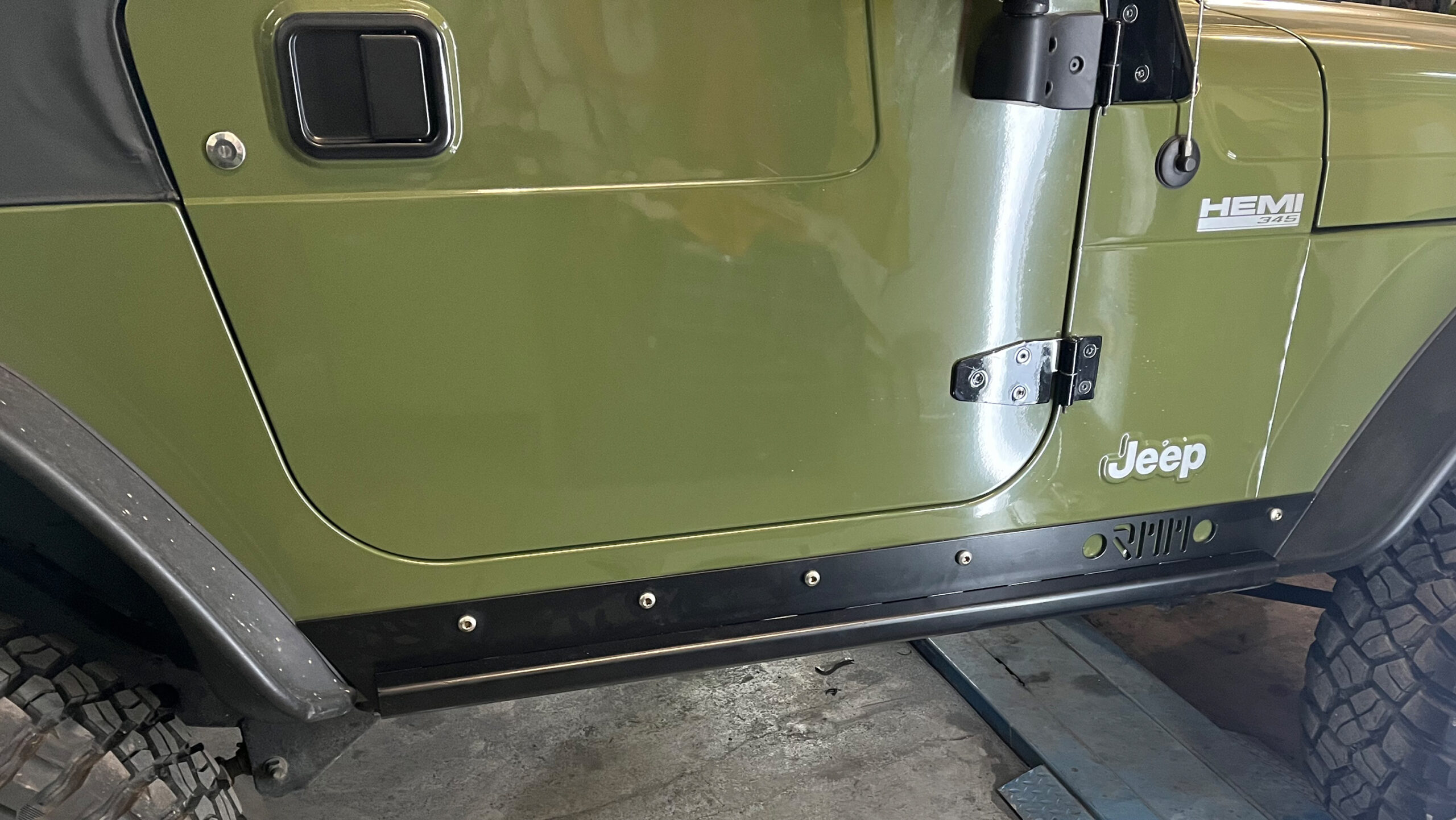 Additionally we offer a 65mm wide rail, which is 10cm longer at both ends and need to be cut by yourself to meet your requirements. 65mm width allows your copilot to have a safer stand on it during countering the car and also it helps to have a little less dirt in the face since it acts like a mud flap more then the narrower version. The extended length has been done to generate a cleaner look on your TJ if you use Hi-line fenders or aftermarket flares and want to have the cleanest look.